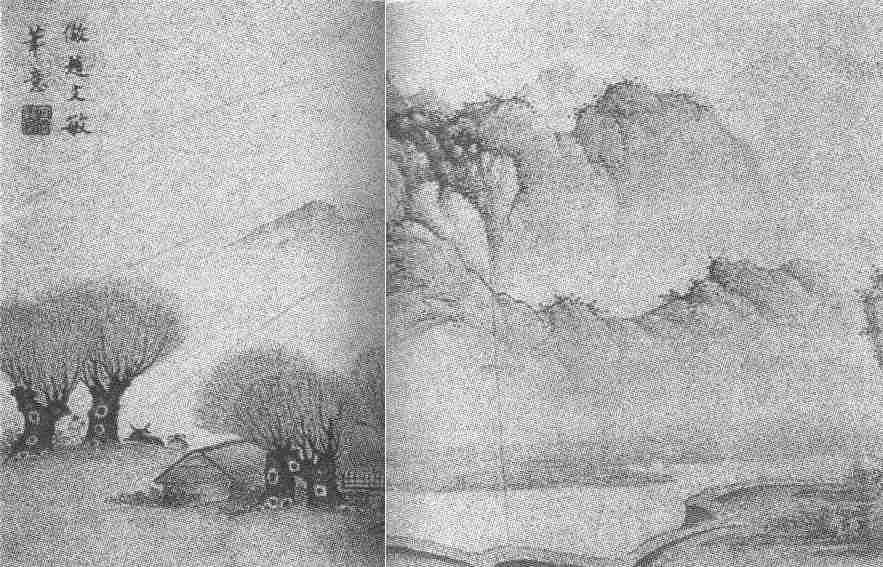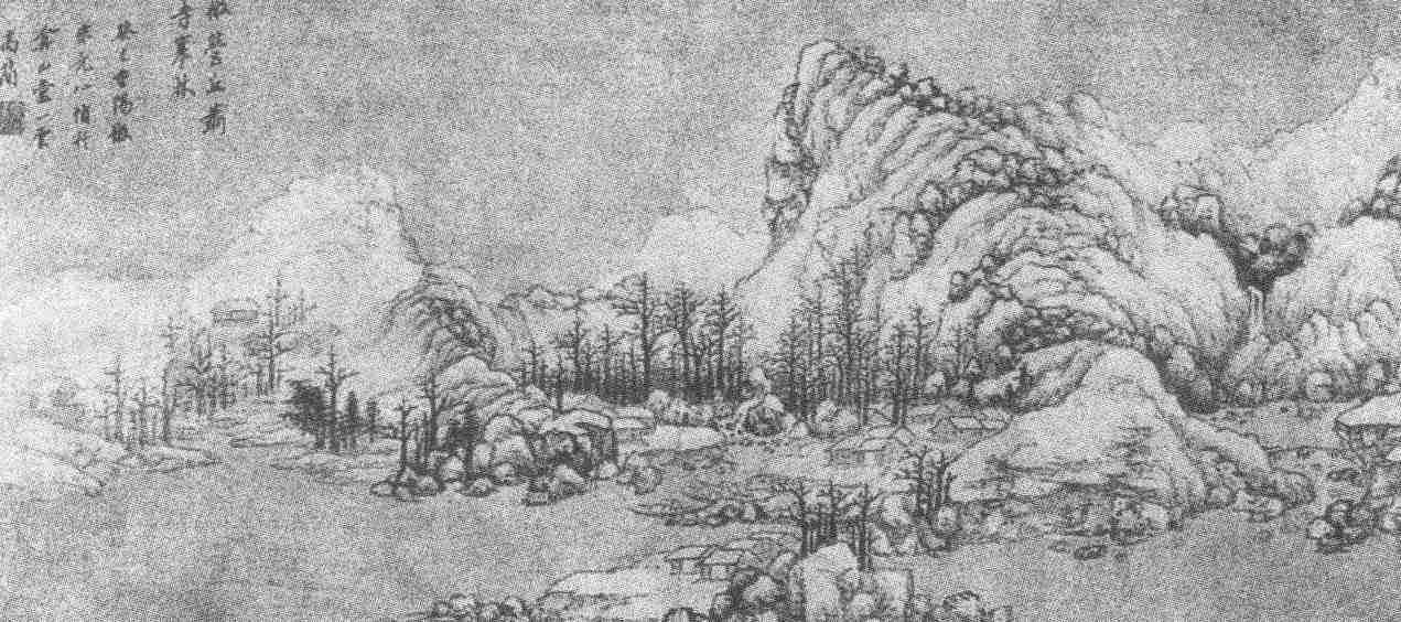 《仿李成萧寺寒林图》描绘的是李成最知名的绘画母题,严冬时节,天低云暗,群山缟素,一片苍茫,山脚一带寒林,幽深寂寞,隐隐几间房舍……景虽是李成的景,但是山水画经过元代文人的洗礼,至此时已经失去了李成细致精严的体制,却感染了元人笔致松秀绵韧的意味,那些山石树木也不再如前人那样小心翼翼地孜孜于逼真的效果,而显出一种胸有成竹式的程式化倾向。尤其是作者一改李成画立轴的形式而为窄长的小帧,纵向的山峦变为横向的走势,立轴高度所产生的严整肃穆之感被手卷徐徐展开的平静悠闲所替代,肃杀之气顿减,灵秀之韵暗生,这也是文人画审美情趣的影响。