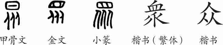 “众”是会意字。甲骨文像众人在弯腰劳动的样子。金文有所变化,三人头上的“日”变成表示监察的“目”了。小篆承接金文而来。隶变后楷书写作“衆”。汉字简化后写作“众”。