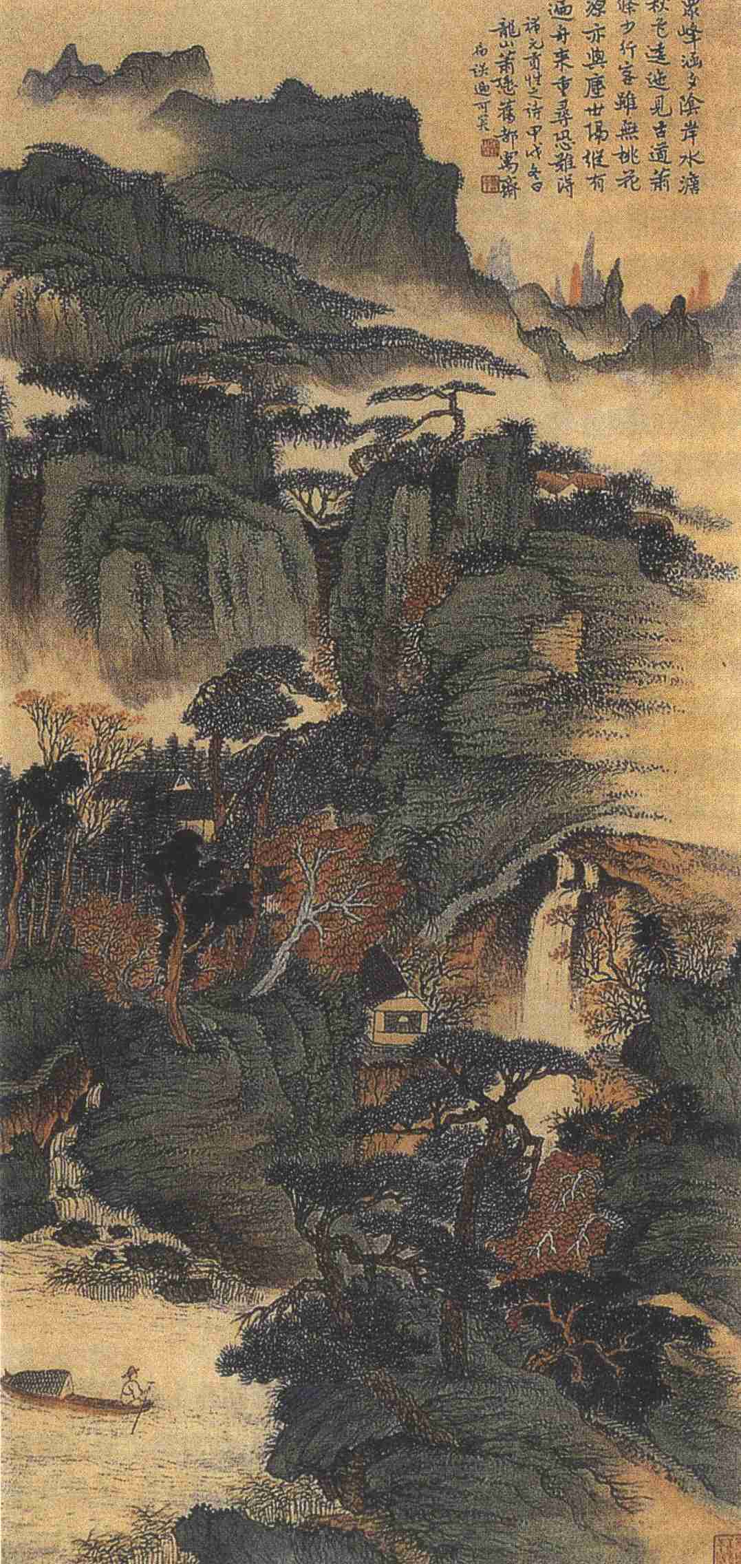 此图以小青绿法敷染。前景作山涧苇汀,一叶渔艇斜仄而出,淡墨勾勒的水波有风起之境;右下角写翠崖拂水,上踞两株姿态伟岸的长松,虬节壮劲,偃仰相偎。中景是纵深通幽的溪涧瀑布,环绕各色杂树,修株密叶,画家以朱磦点染浓浓的秋意。而巉岩峭壁错叠而上,蜿蜒展开辽远开阔的远景,仍是林木交合,一片郁秀苍蔚;间或几株红叶树,与中前景相呼应;最远方兀立的孤峰则是几笔朱砂色写成,点出了晚霞夕映的题中意。尤值得一提的是景层间那几段精心设计的空白,如烟岚流动,令画境从容有度、张弛疏密之中更显气格的宏大深远。从这张画的经营布局、物象描绘,我们可以获知画家对传统茹涵之深。他在处理近、中、远三景的空间呼应,树木的开合俯仰、高低错落以及层峦稠密交叠的关系时,不乏对王蒙《清卞隐居》、沈周《庐山高》等图的位置安排的借鉴;他笔端的松针画法、松树的形态有石涛、梅清的风范,郁郁勃勃,又简练概括;而以淡墨侧锋的横解索皴勾画山岩,重重叠叠的色墨渴点写密苔丰草,其间赋予画面的苍厚松秀,又使这幅作品在精工周全之中另生一段清逸灵婉的诗情。