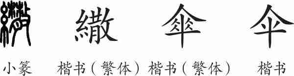 “伞”是象形字。上边像张开的遮蔽蓬,下边像把和支架,像极了为人挡雨遮阳之物。其字本写作“繖”,俗写作“傘”,汉字简化后写作“伞”,而“繖”就废弃不用了。