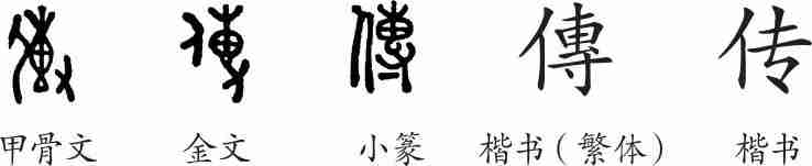 “传”是会意兼形声字。甲骨文从人,从専(转动),会供人转换车马的驿站、驿舍之意,専兼表声。隶变后楷书写作“傳”。汉字简化后写作“传”。