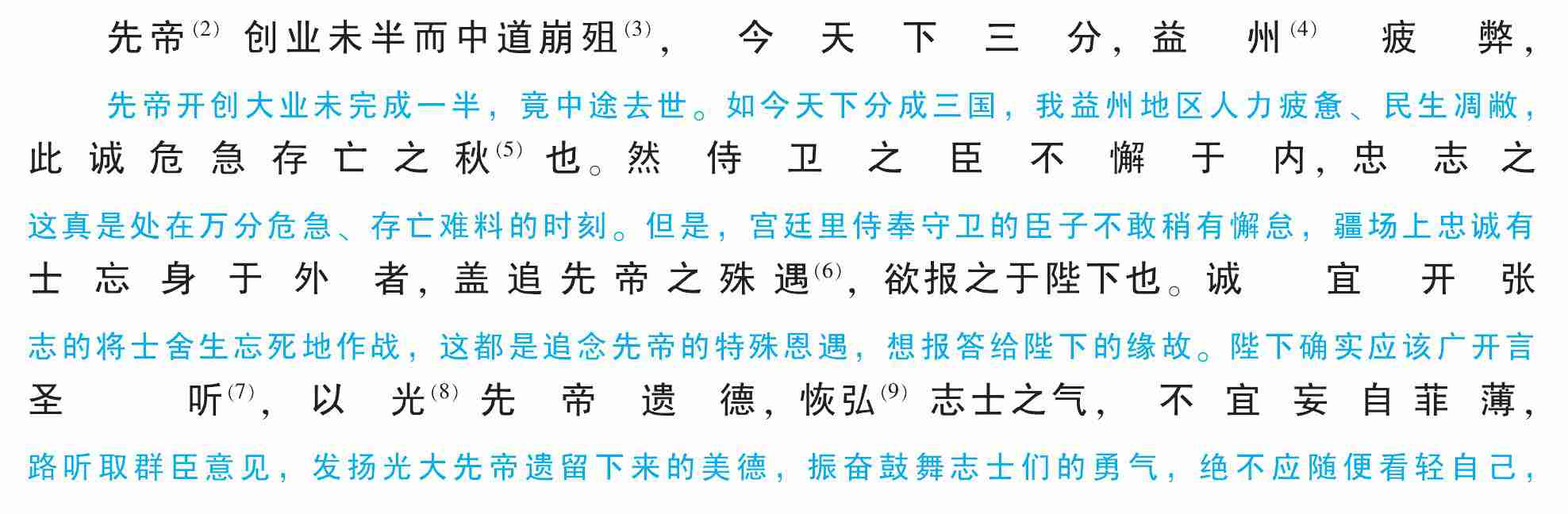 先帝(2)创业未半而中道崩殂(3),今天下三分,益州(4)疲弊,此诚危急存亡之秋(5)也。然侍卫之臣不懈于内,忠志之士忘身于外者,盖追先帝之殊遇(6),欲报之于陛下也。诚宜开张圣听(7),以光(8)先帝遗德,恢弘(9)志士之气,不宜妄自菲薄,引喻失义(10),以塞忠谏之路也。