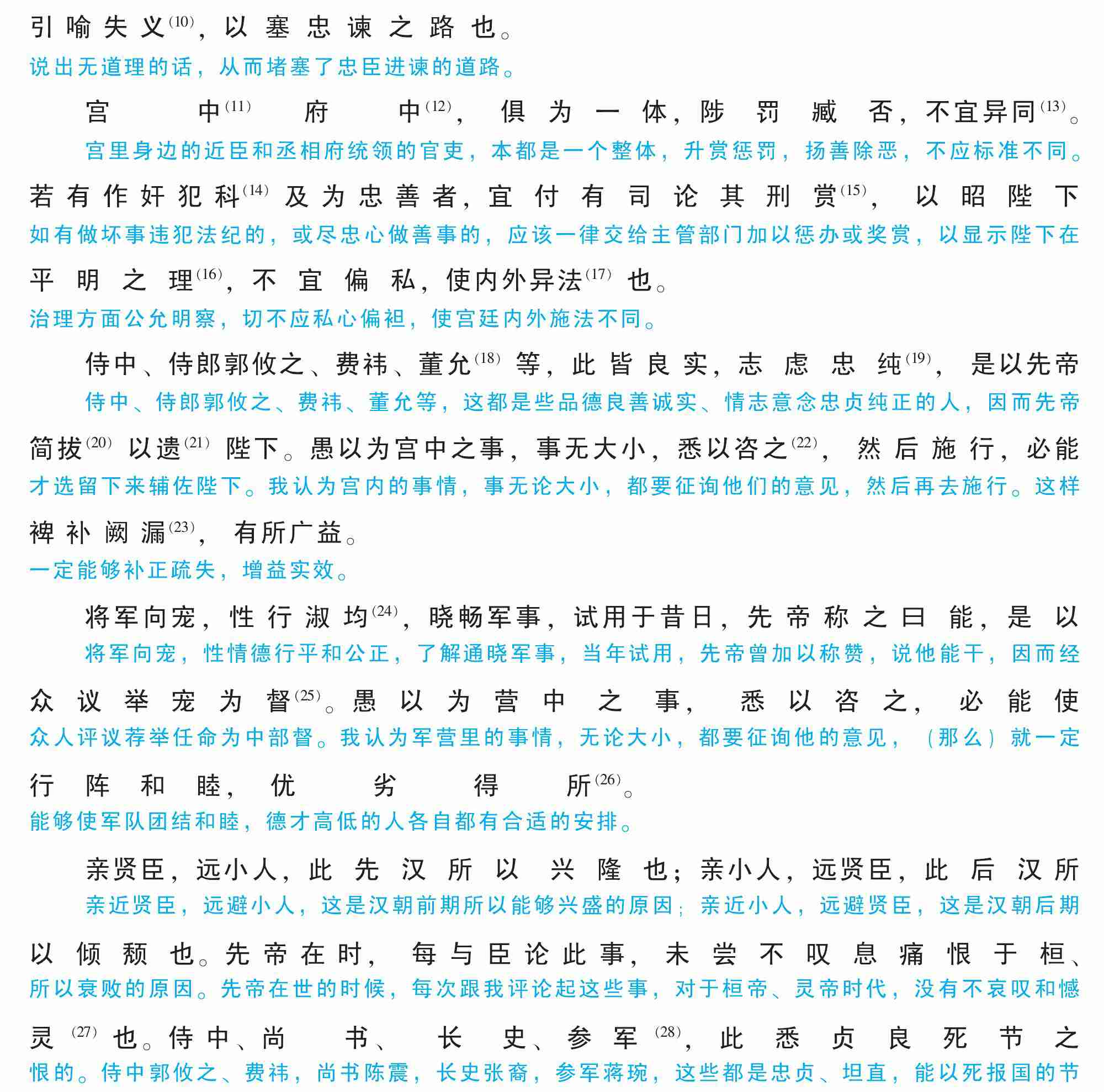 侍中、侍郎郭攸之、费祎、董允(18)等,此皆良实,志虑忠纯(19),是以先帝简拔(20)以遗(21)陛下。愚以为宫中之事,事无大小,悉以咨之(22),然后施行,必能裨补阙漏(23),有所广益。