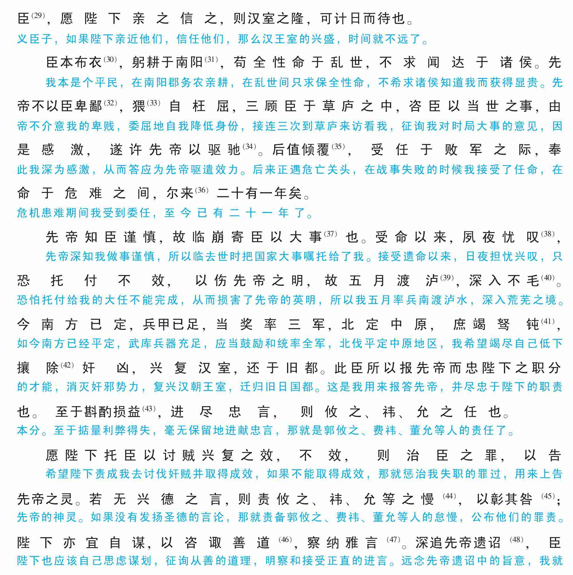 臣本布衣(30),躬耕于南阳(31),苟全性命于乱世,不求闻达于诸侯。先帝不以臣卑鄙(32),猥(33)自枉屈,三顾臣于草庐之中,咨臣以当世之事,由是感激,遂许先帝以驱驰(34)。后值倾覆(35),受任于败军之际,奉命于危难之间,尔来(36)二十有一年矣。