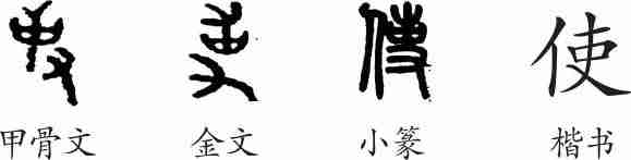 “使”是会意兼形声字。甲骨文像手持猎叉打猎之形。金文大致相同,小篆另加义符“人”,以突出人做事之意,从人从吏会意,吏兼表声。隶变后楷书写作“使”。