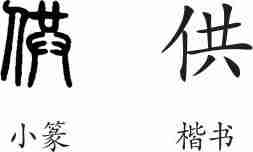 “供”是形声字。小篆从亻,共声。隶变后楷书写作“供”。