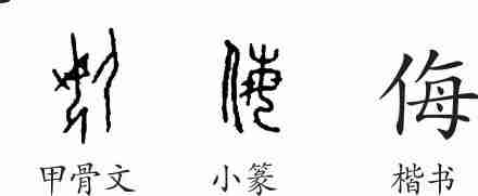 “侮”是会意兼形声字。甲骨文左边像一个向左跪坐的妇女,右边是一个向左侧立的人,会轻慢之意。小篆变为从人,每声。隶变后楷书写作“侮”。