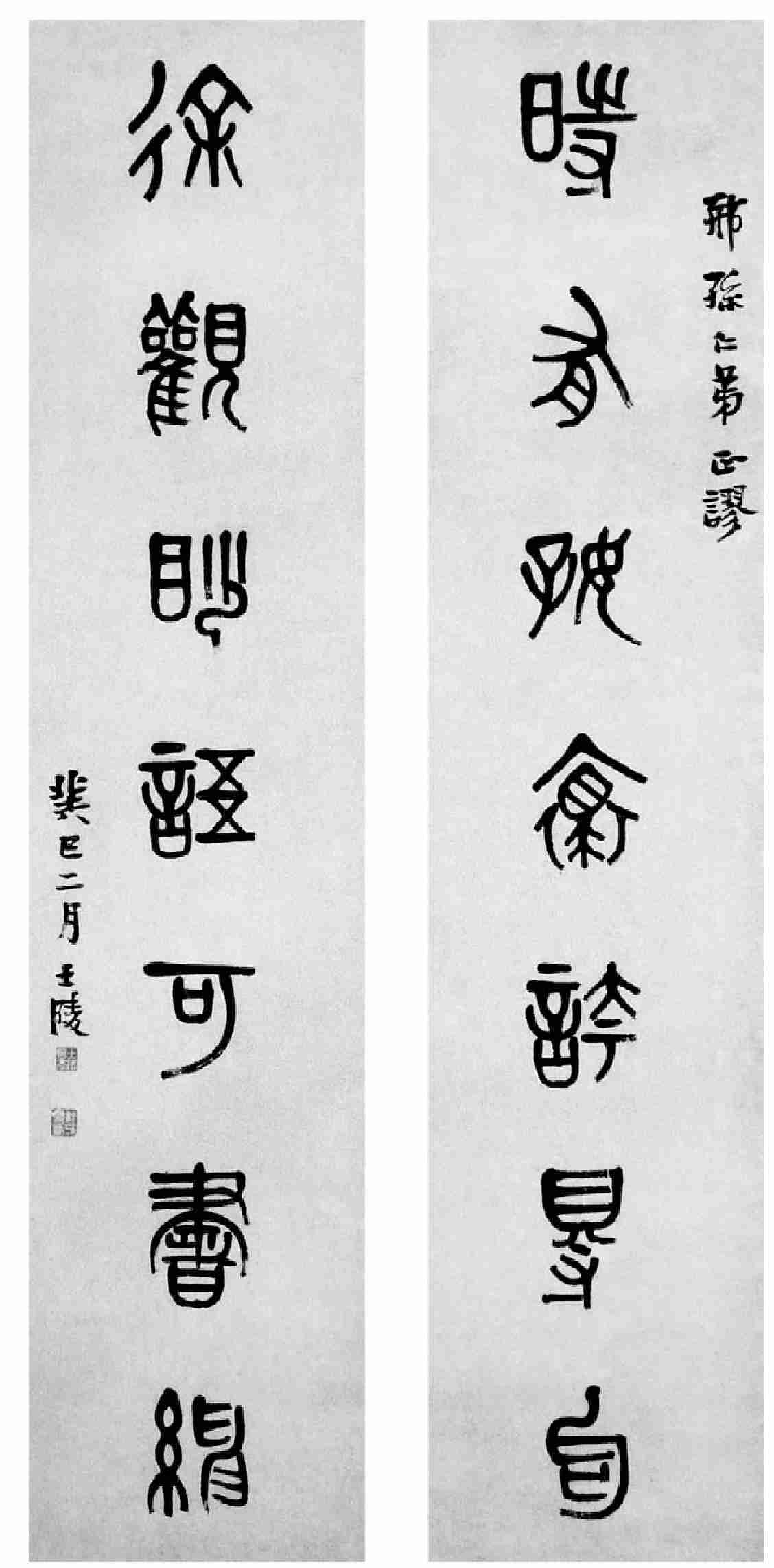 黄牧甫篆书联,上钤“士陵长年”、“穆父学篆”印