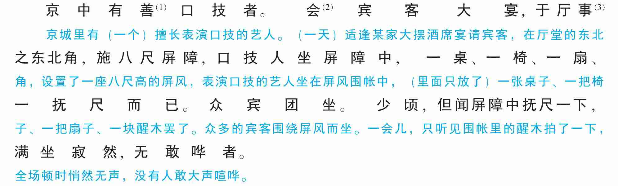 京中有善口技者。会(2)宾客大宴,于厅事(3)之东北角,施八尺屏障,口技人坐屏障中,一桌、一椅、一扇、一抚尺而已。众宾团坐。少顷,但闻屏障中抚尺一下,满坐寂然,无敢哗者。