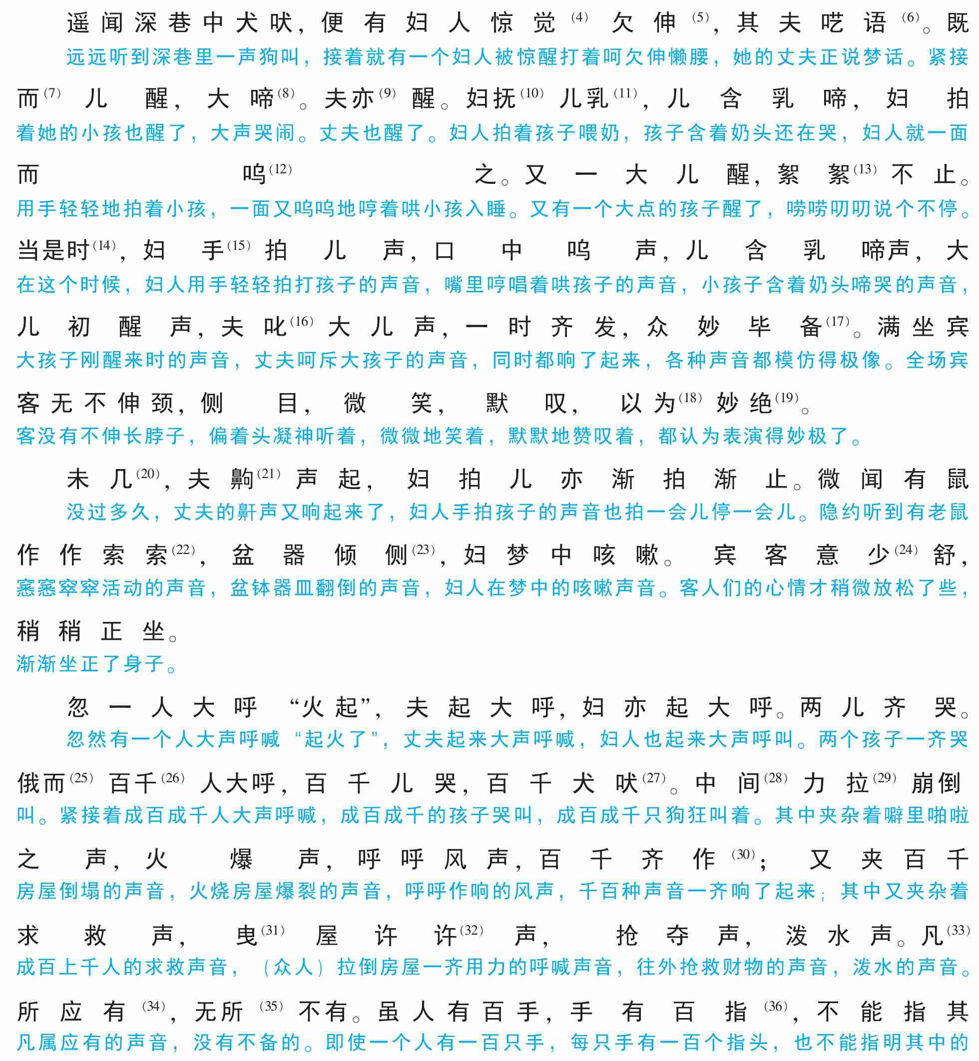 遥闻深巷中犬吠,便有妇人惊觉(4)欠伸(5),其夫呓语(6)。既而(7)儿醒,大啼(8)。夫亦(9)醒。妇抚(10)儿乳(11),儿含乳啼,妇拍而呜(12)之。又一大儿醒,絮絮(13)不止。当是时(14),妇手(15)拍儿声,口中呜声,儿含乳啼声,大儿初醒声,夫叱(16)大儿声,一时齐发,众妙毕备(17)。满坐宾客无不伸颈,侧目,微笑,默叹,以为(18)妙绝(19)。