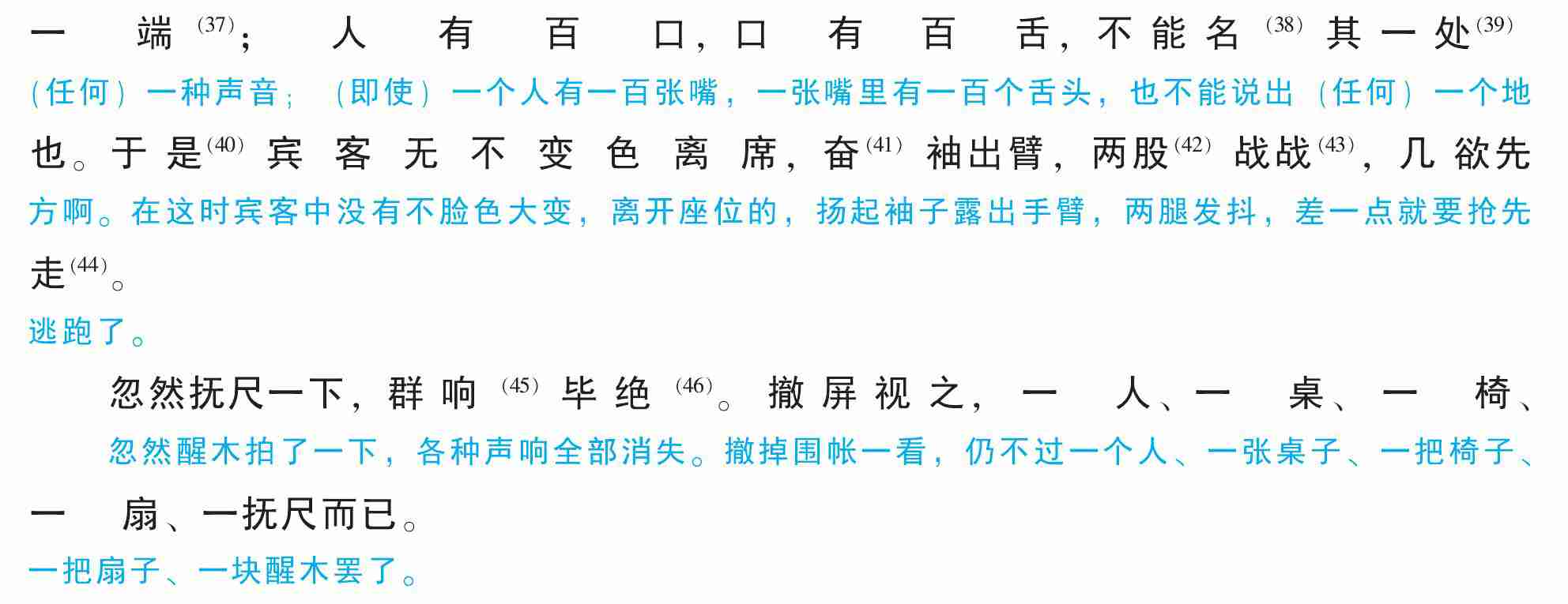 忽然抚尺一下,群响(45)毕绝(46)。撤屏视之,一人、一桌、一椅、一扇、一抚尺而已。