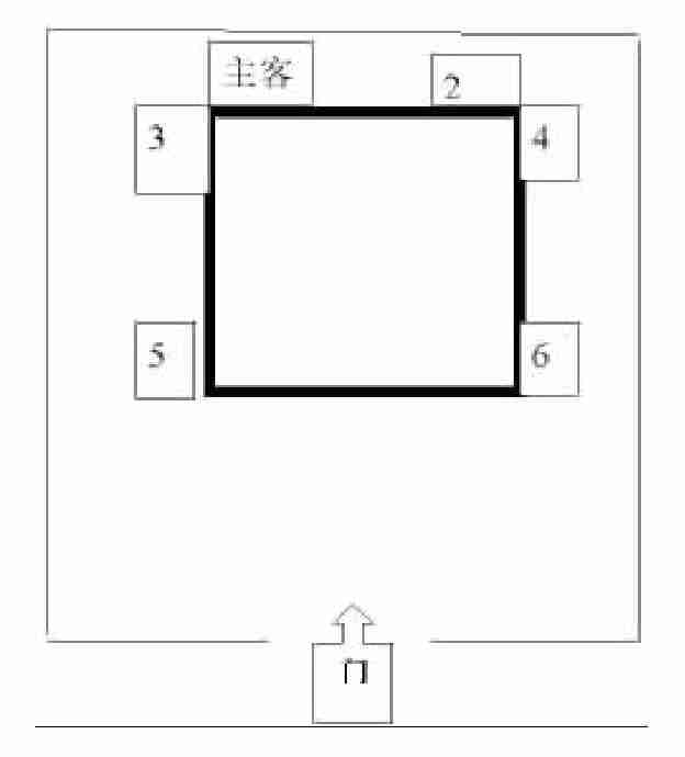 当下宴席多为圆桌,正对大门的位置为主客,左手边依次为2、4、6,右手边依次为3、5、7,直至汇合(见图)。如果是八仙桌,则正对大门一侧的右位为主客。如果不正对大门,则面东一侧右席为首席。然后由首席左边开列为2、4、6、8,右边为3、5、7(见图)。家宴的位置按照辈分排列,首席为辈分最高者,末席为辈分最低者。