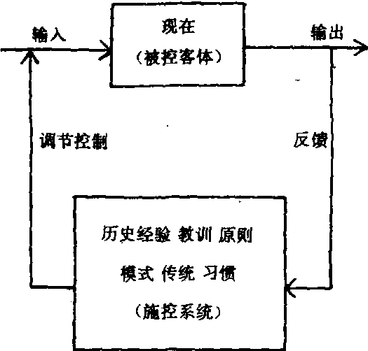用历史的联系、传统的力量和以前的原则来制约现在,使现在按照历史的样子继续重演的思维方法。它面向过去,面向历史,总是用过去怎样做来要求现在,故称“后馈式”思维方法。它用以往思维样式要求现在,思维过程表现出一贯性运动特点,故又称“惯性”思维方法。其一般模式如下图示: