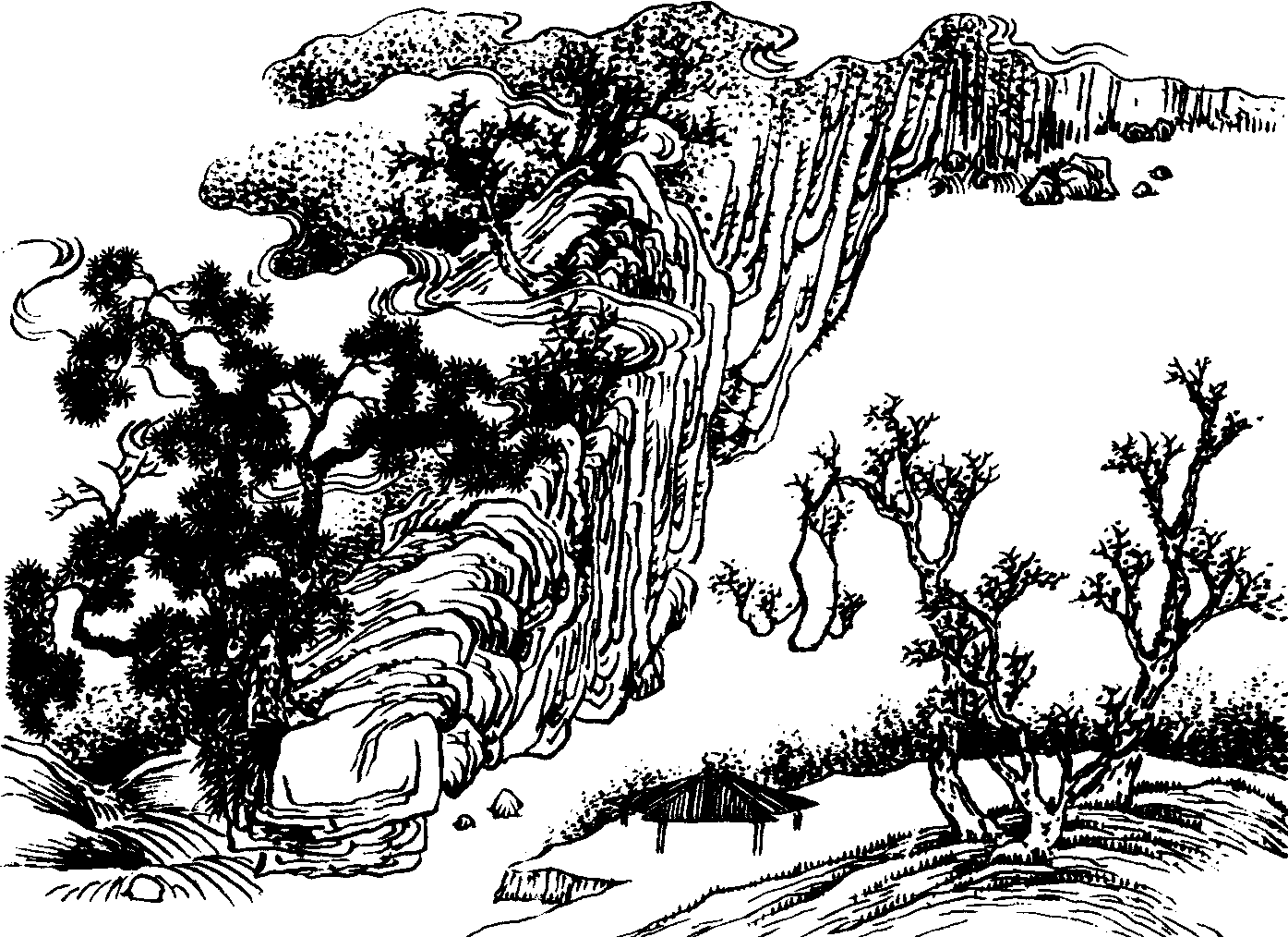 再下,又以“响屟廊”之故典增一层皴染。相传吴王筑此廓,令足底木空声彻,西施着木屟行经廊上,辄生妙响。词人身置廓间,妙响已杳,而廓前木叶,酸风吹之,飒飒然别是一番滋味——当日之“双鸳” (美人所着鸳屟),此时之万叶,不知何者为真,何者为幻?抑真者亦幻,幻者即真耶?又不禁感慨系之矣!而上片至此一束。