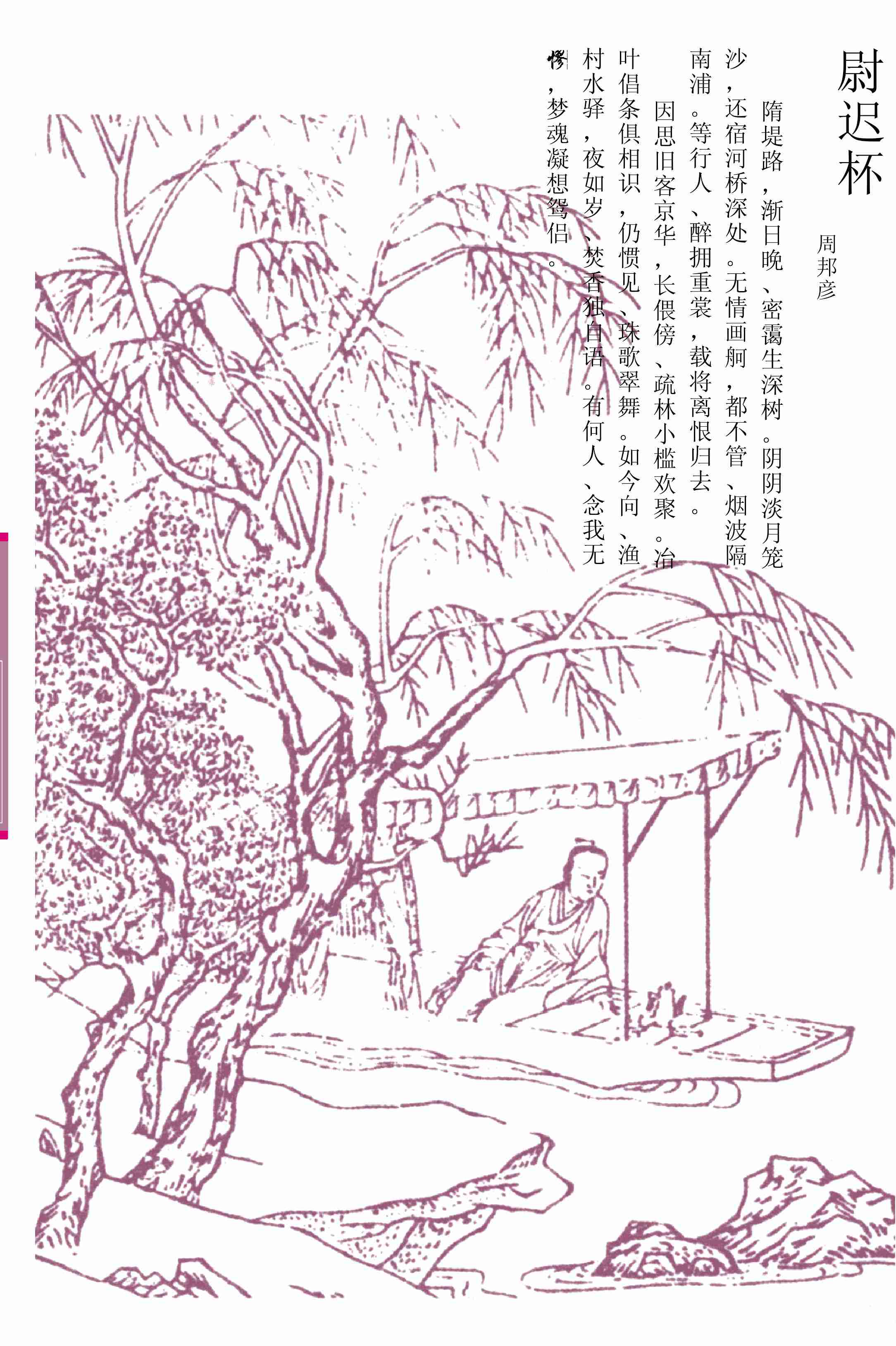 隋堤路①,渐日晚、密霭生深树。阴阴淡月笼沙,还宿河桥深处。无情画舸,都不管、烟波隔南浦②。等行人、醉拥重裳,载将离恨归去。