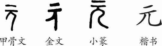 “元”是指事字。甲骨文从兀(削去人的头发),又用短横指明头的部位,以表示人头。金文大致相同,小篆的形体整齐化。隶变后楷书写作“元”。