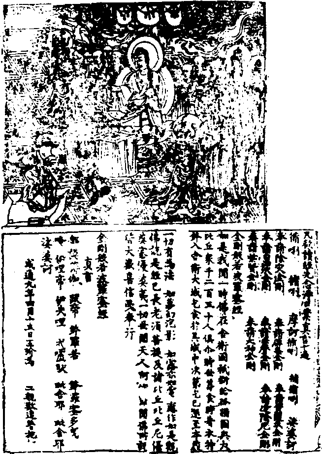 现存世界上最早的有明确刻印日期记载的雕版印刷书。刻印于唐懿宗咸通九年(868)。1900年在敦煌被发现,1907年被英籍匈牙利人斯坦因(Aurel Stein)窃走,现存英国不列颠博物馆。整部经书作卷子装。卷首扉画框高24厘米,宽28.5厘米。正文前是净口业真言,共五行;正文包括首尾题名,共287行;正文后又是真言,共四行;最后题款一行。总共296行,每行十九或二十字不等,总计约镌5000字。正文框高24厘米,全长463厘米,加上卷首扉画28.5厘米,总长则为491.5厘米。卷首扉画描写的是释迦牟尼佛坐祗树给孤独园对长老须菩提及众僧说法的故事。图中人物共22人,狮子二头,加上经、经幢、祥云、砖地、莲座、佛光,显得构图错综复杂,但又中心突出,层次分明,错落有致。人物形象各异,面部表情、站行神态都很生动自然。各种线条流畅明快。整个扉页显得古朴大方。正方字体为端楷,浑朴厚重,气势磅礴。镌刻刀法剔透稳健,行气严整。麻纸印造,墨色纯正。四周镌刻粗墨边栏,但文字行与行之间未镌界行。