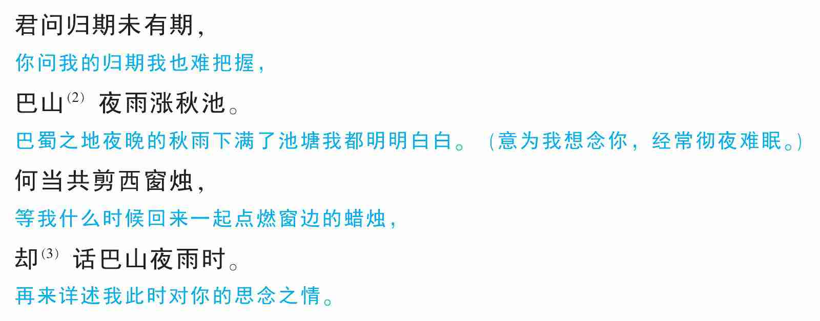 (1)选自 《李义山诗集 》, 李商隐 (约813—约858), 字义山 。 怀州河内 (现在河南沁阳 ) 人 。 唐代诗人 。(2) 〔巴山〕 泛指巴蜀之地。 (3) 〔却〕 再。