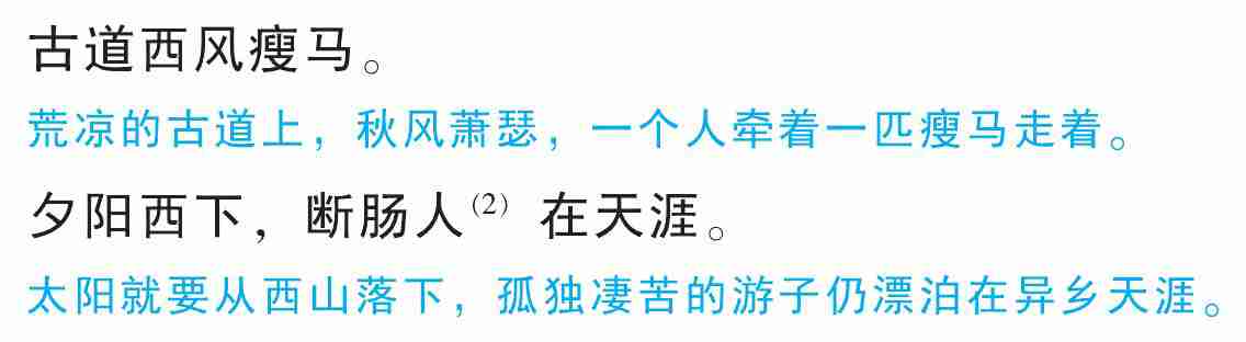《天净沙·秋思》 是散曲, “天净沙” 是曲牌名, 秋思是题目, 一共只有五句, 写一个飘零异地的游子在秋天思念故乡, 将秋郊黄昏之景与羁旅行径之愁结合在一起写,情调比较低沉, 但是艺术上很有独到之处, 是负有盛名的情景交融的佳作。 元人周德清 《中原音韵》 书中称之为 “秋思之祖”, 近人王国维 《人间词话》 书中誉为 “深得唐人绝句妙境”。