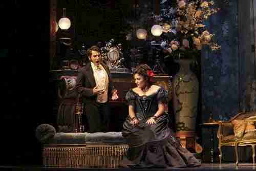 改动最大的还是最后一幕,维奥莱塔一个人住在被债主查封的房子里,在弥留之际见到了匆忙赶回来的Alfredo和老阿芒。父亲出于内疚已经向Alfredo解释清楚了一切,Alfredo痛哭着向维奥莱塔忏悔。维奥莱塔一直等待着Alfredo的归来,等待着他再次带给她生活的勇气和生命的力量。她惊喜交加的迎向爱人,却发现孱弱的身体没有半点好转的迹象。她在众人的帮助下躺回病床上,像个贤良妻子一样对Alfredo交代后事,让他不可以太悲伤,一定要娶妻生子,照顾好可敬又年老的父亲。最后她听到了上帝的召唤,带着脸上带着神圣的光辉死去了。