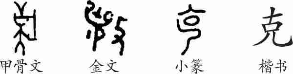 “克”是象形字。甲骨文像戴盔执戈的武士之形,表示攻打战胜之意。金文承接甲骨文,但将右边改为“攴”。小篆书线条化。隶变后楷书写作“克”。