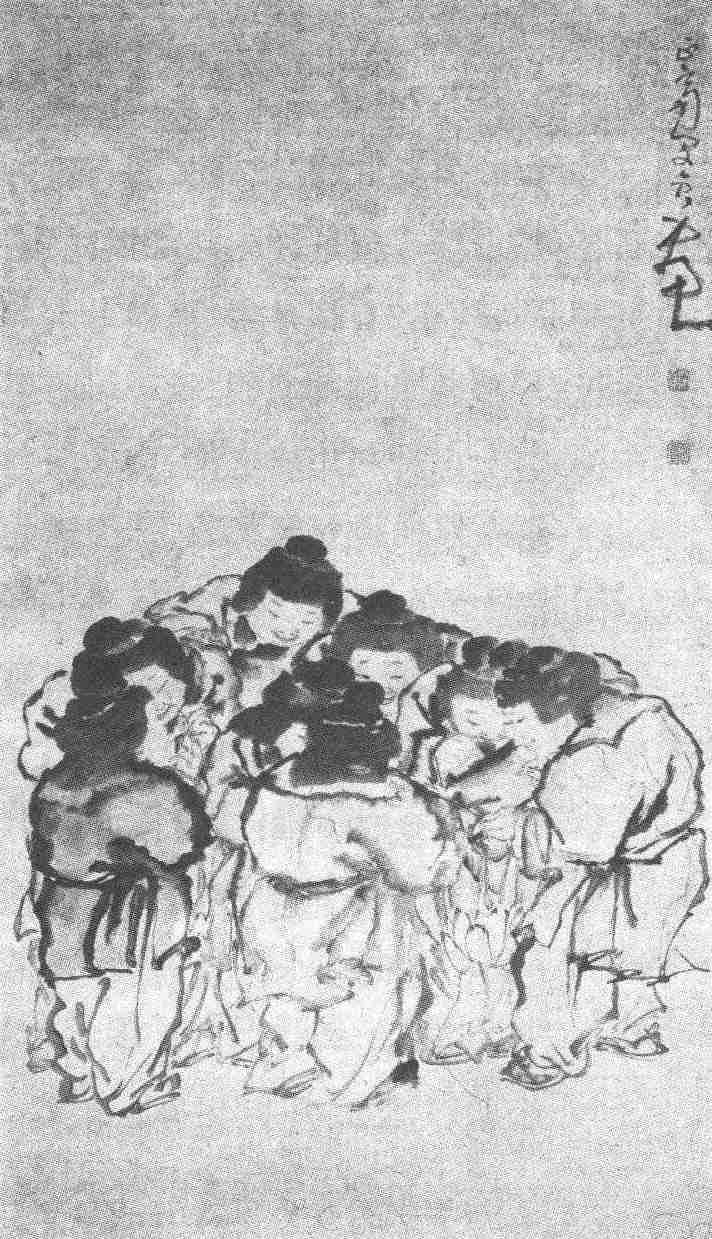 团团状的构图,是画家喜用的形式,若经营不好,容易产生呆板的毛病,但他处理得很巧妙,在笔墨上,小孩头、帽全用泼墨晕染,衣纹随意转折,或虚或实,或浓或淡,在统一中求变化,造成水墨淋漓、气韵生动的艺术效果。这是闵贞与“扬州八怪”其他画家相异处。