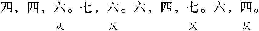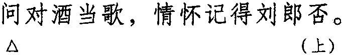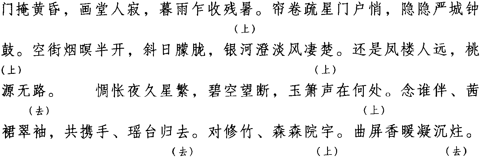 注:本词例押古上声“纸” “语” “麌” 韵,古去声“御” “遇” 韵。因 “纸”“语” “麌” “御” “遇” 在现代韵中属 “衣” “居” 韵。故全调可押衣部“衣” “居”韵。本词例亦可押姑部“姑”韵。因 “暑” “鼓” “楚” “处”“路” “炷” 属“姑” 韵,“去” “宇” “否” 在古韵中与“纸” “语” “麌”同韵,而“纸” “语” “麌” 在现代韵中同属“衣” 韵,而“麌” 在古韵中与“鼓” 同韵,“鼓” 在现代韵中属“姑” 韵,故全调亦可押“姑” 韵。