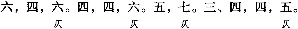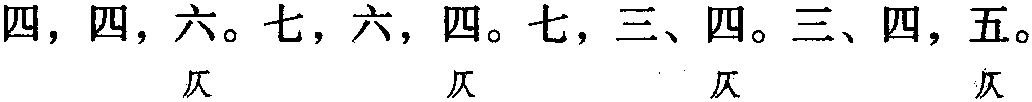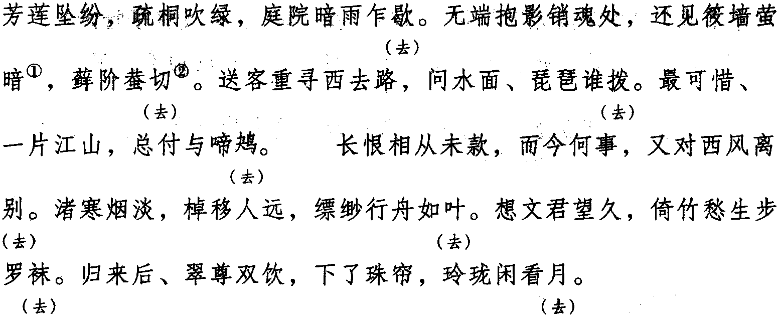 注:一、本词例押些部“些” 韵。本押古入声“月” “屑” “叶” “曷”韵,因“月” “屑” “叶” 在现代韵中属 “些” 韵,“曷” 在古韵中与 “越”同韵,而“越” 在现代韵中亦属“些”韵,故全调可押“些”韵。