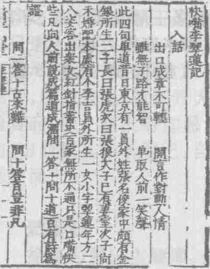 东京城内李员外之女李翠莲,经人介绍,与张狼结成姻缘。李翠莲年方二八,姿容出众,女红针指,书史百家,样样精通,只是心直口快,嘴无遮拦,“凡向人前,说成篇,道成溜,问一答十,问十道百”,为封建卫道者所不容。临出嫁时,父母吩咐她遇事须言语谨慎,“多之众所忌”,她口里说“晓得”,心里早忘个精光。成亲那天,迎亲花轿刚到张家门口,媒婆手拿一碗,叫她开口接饭,李翠莲张口就骂媒婆是“嚼嘴黄”,气得她一溜烟进屋而去。与丈夫拜堂时,她对这套传统的繁文缛节很不以为然,遂脱口而出,惹得公公、婆婆等人大为吃惊,对这个没规矩的新媳妇深感不满。新婚之夜,依俗撒帐,李翠莲也不买撒帐先生的情,用难听的语言把他赶到门外。面对丈夫,她也不改“多嘴”、“快舌”的禀性,闹得张狼一夜不得安睡。这样如此三番,李翠莲得罪了丈夫和公婆全家,婚后仅三天,就被他们休掉。她回到娘家,也得不到家人的理解,只得到前街明音寺中去度过余生。