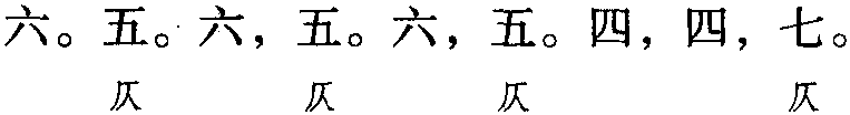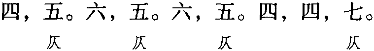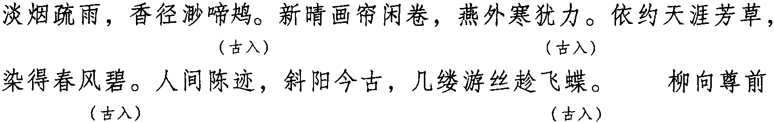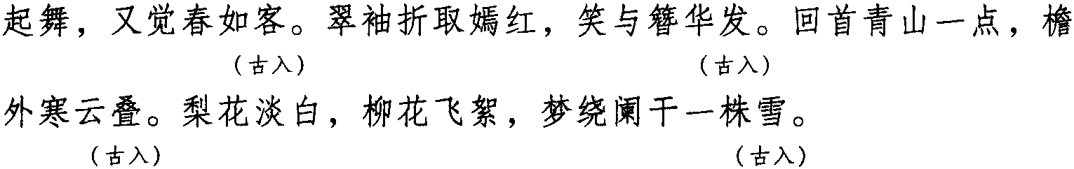 注: 本词例押古入声 “月” “屑” “陌” “职” “叶” 韵。因 “月” “屑” “叶”在现代韵中属“些”韵,“陌” 与 “液” 在古韵中同韵,而 “液” 在现代韵中亦属 “些” 韵,“职” 与 “些” 属通韵,故全调可押些部 “些” 韵。