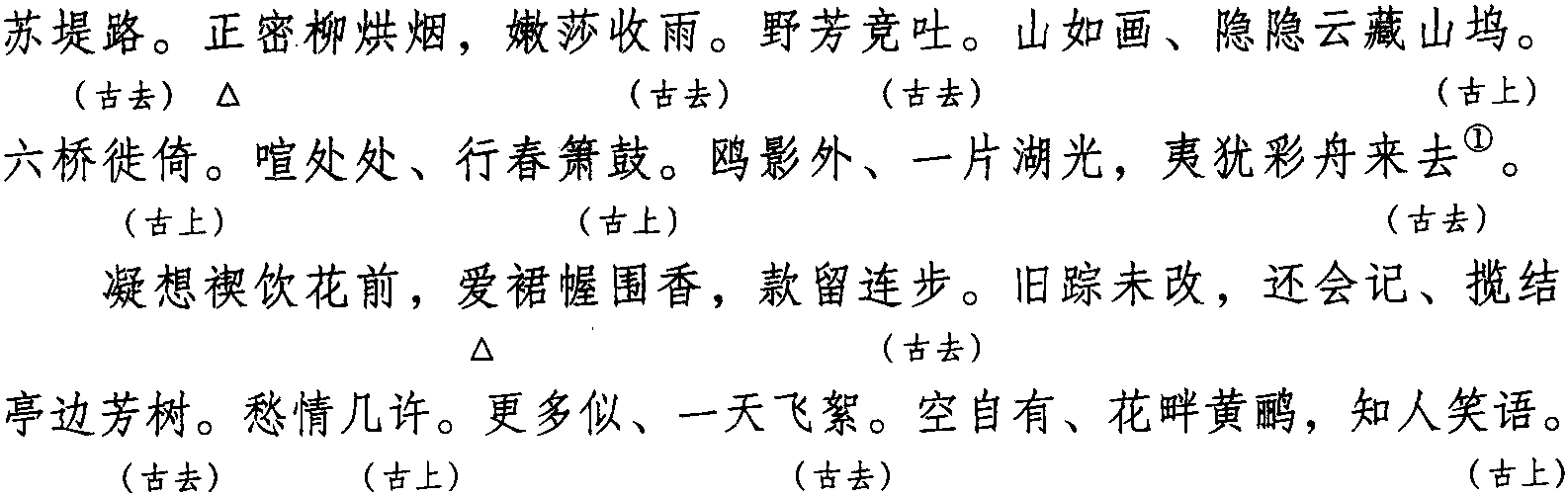 注:一、本词例押古上声“纸” “语” “麌” 韵,古去声“御” “遇” 韵。因“纸” “语” “麌” “御” “遇” 在现代韵中属 “衣” “居” 韵,故全调可押衣部“衣” “居” 韵。