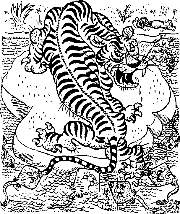 老虎把脚爪高高举起,痛得直叫; 看到岸边的水浑浊得好像河底的污泥都翻了上来,它已经明白,正是那些鹞鱼不让他过河。于是它怒吼着: