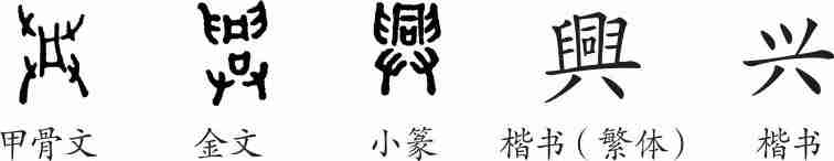 “兴”是会意字。甲骨文的四角是四只手,中间抬着一个“井”形器物,会一声号子四手共同抬起一个井盘放到井上之意。隶变后楷书写作“興”。现在简写作“兴”。