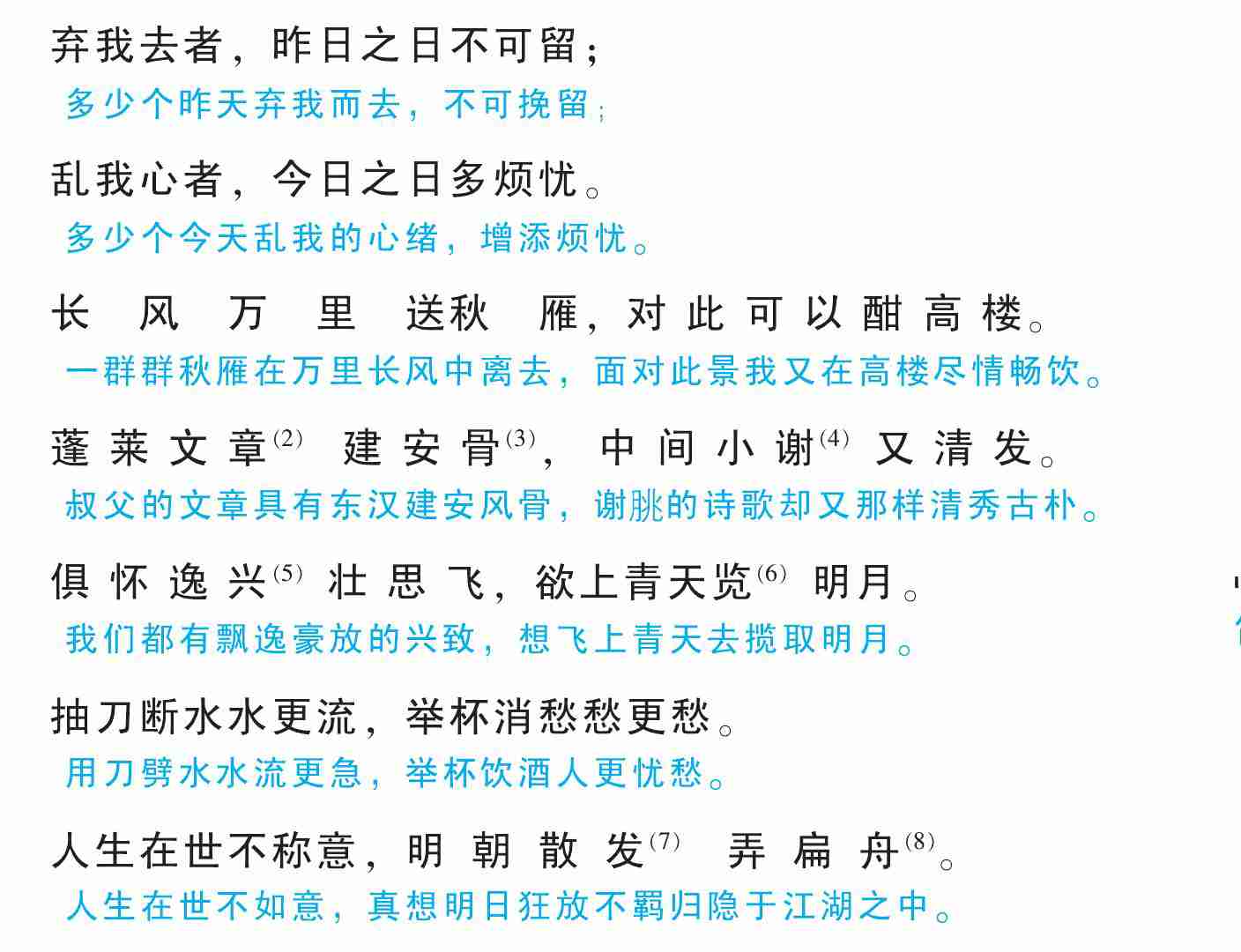 (1) 选自 《李太白全集》。 宣州, 今安徽宣城。 谢脁楼, 又名北楼或谢公楼。 校书叔云, 官秘书省校书郎, 或谓即李云。 (2) 〔蓬莱文章〕 指文章繁富。 (3) 〔建安骨〕 建安风骨, 指建安时期以曹操父子和 “建安七子” 的诗文创作为代表的文学风格。 建安, 为汉献帝的年号。 (4) 〔小谢〕 谢脁 (464—499), 字玄晖, 南朝齐诗人, 后人将其与南朝宋诗人谢灵运并列, 称他为 “小谢”, 这里用以自喻。 (5) 〔逸兴〕 飘逸豪放的兴致。 (6) 〔览〕 通“揽”, 摘取。 (7) 〔散发〕 这里形容狂放不羁。 (8) 〔弄扁(piān)舟〕 指隐逸于江湖之中。 扁舟, 小船。