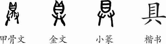“具”是会意字。甲骨文中间是“鼎”,下部为手,用手捧鼎会酒食具备之意。金文中间是“貝”。隶变后楷书写作“具”。