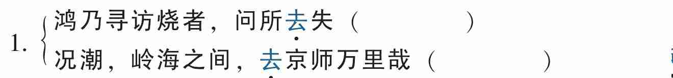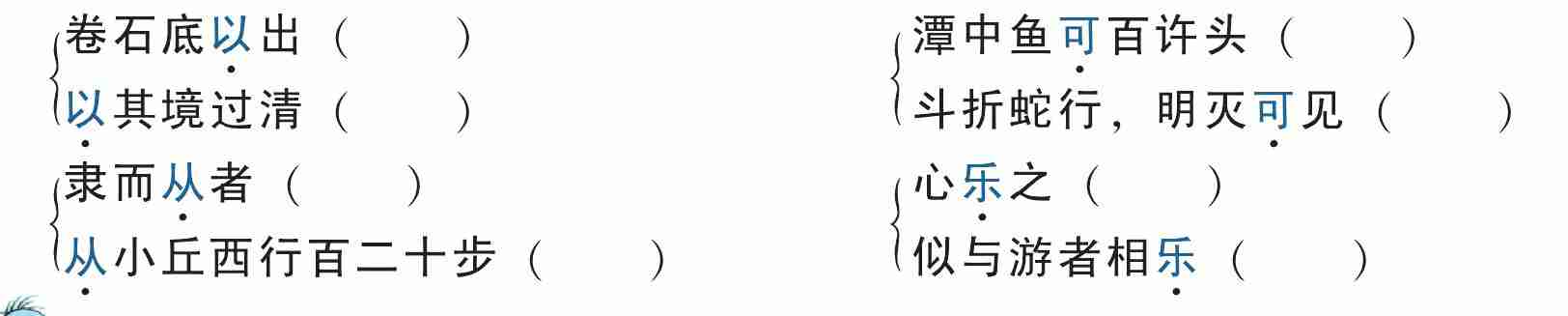 1. 近岸 ,卷 ( ) 石底以出, 为坻 ( ), 为屿 ( ), 为嵁 ( ), 为岩。 青树翠蔓 ( ), 蒙络摇缀 ( ),参差 ( ) 披拂。