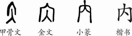 “内”是会意字。甲骨文上为房屋之形,下为人,会人进入房内之意。金文与甲骨文相似。小篆承接金文并整齐化。隶变后楷书写作“内”。