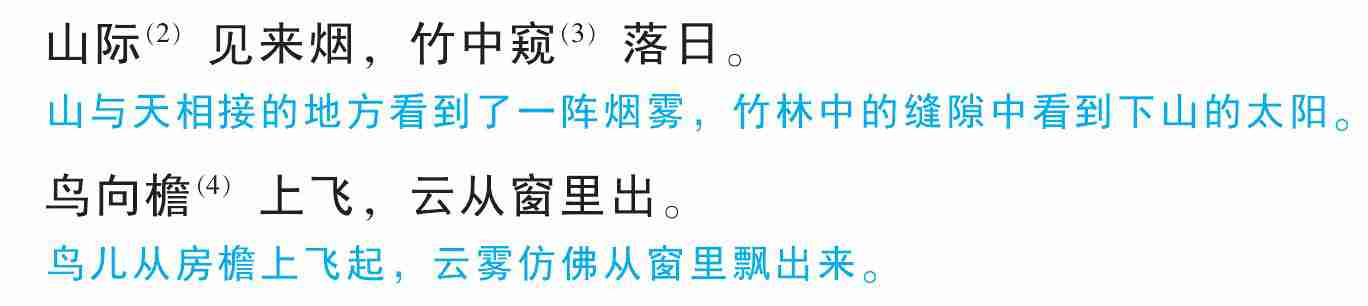 山际(2)见来烟, 竹中窥(3)落日。