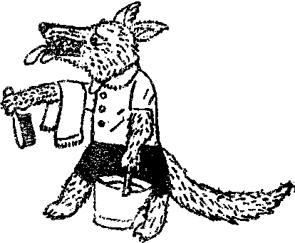 大狼慌慌张张拿起水桶、刷子、毛巾和两块肥皂,跟在后面跑。