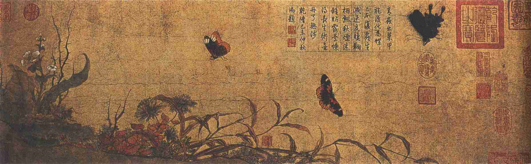 清晨,在和煦的阳光下,露气轻拂,大地一片清新蓊郁。在山丘一隅,一簇杂卉,舒展着茎叶,沐浴着晨露,越发显得娇翠玉立;各色花朵,笑脸迎春,散发出阵阵清香。这时一只蚱蜢钻出花丛,忽然发现了什么,睁着大眼凝视前方。啊!原来花丛外有三只美丽的蛱蝶,正摇动着翅膀,悠闲自在地玩耍……大地是这样地宁静而富有诗意,却又瞬息万变而和谐,这就是《写生蛱蝶图》给我们的感受。