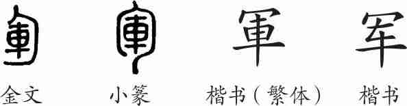 “军”是会意字。金文从車,从匀(环绕包围),会以车环绕包围之意。小篆承接金文而来,并线条化、整齐化。隶变后楷书写作“軍”。汉字简化后写作“军”。