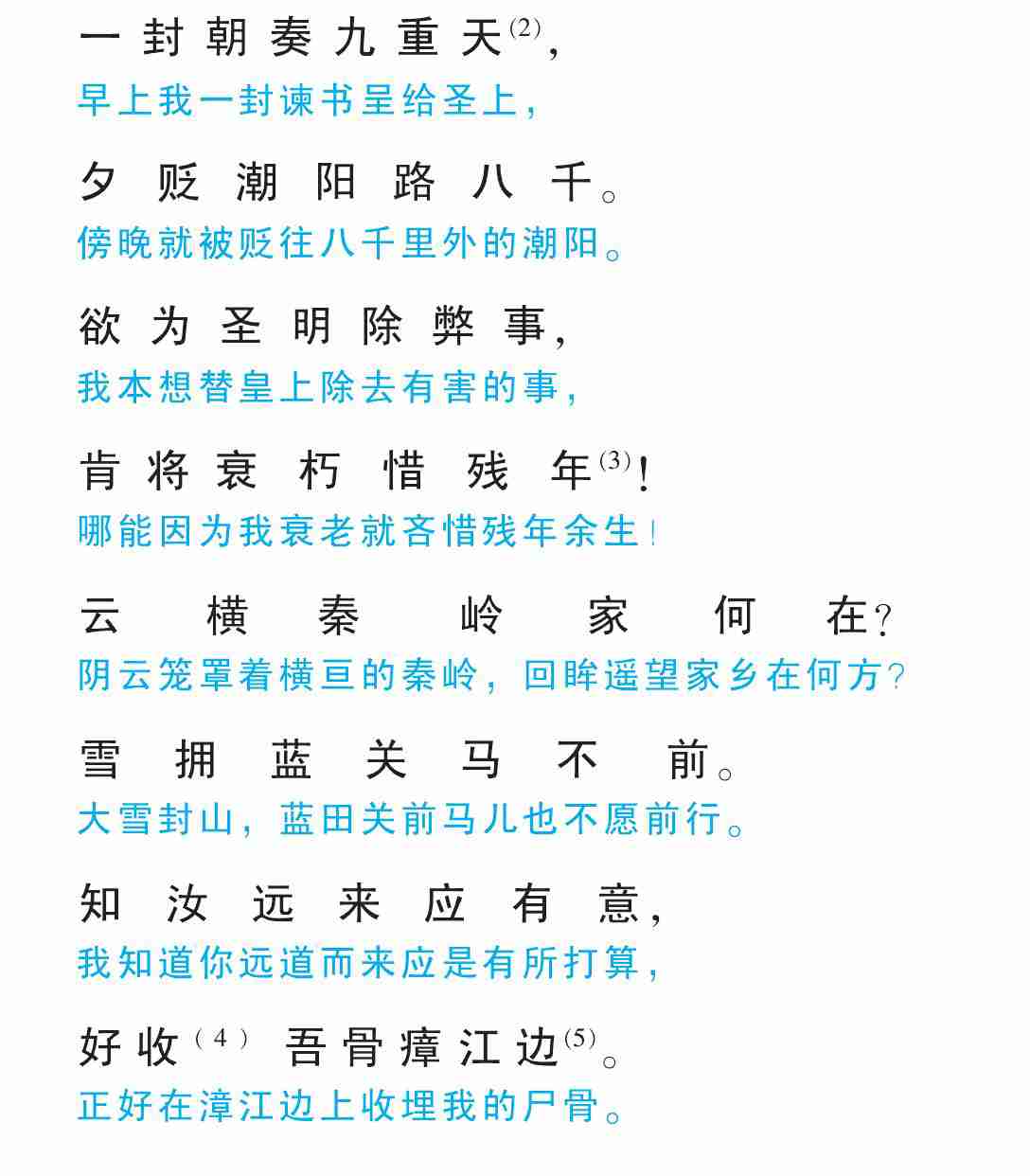 (1) 〔左迁〕 遭贬官。 (2) 〔九重天〕 借指皇宫。 (3) 〔惜残年〕 吝惜老命 。 (4) 〔收 〕 收拾 。 (5) 〔瘴江边〕 指潮州, 当时岭南一带多致人疾病的瘴气。