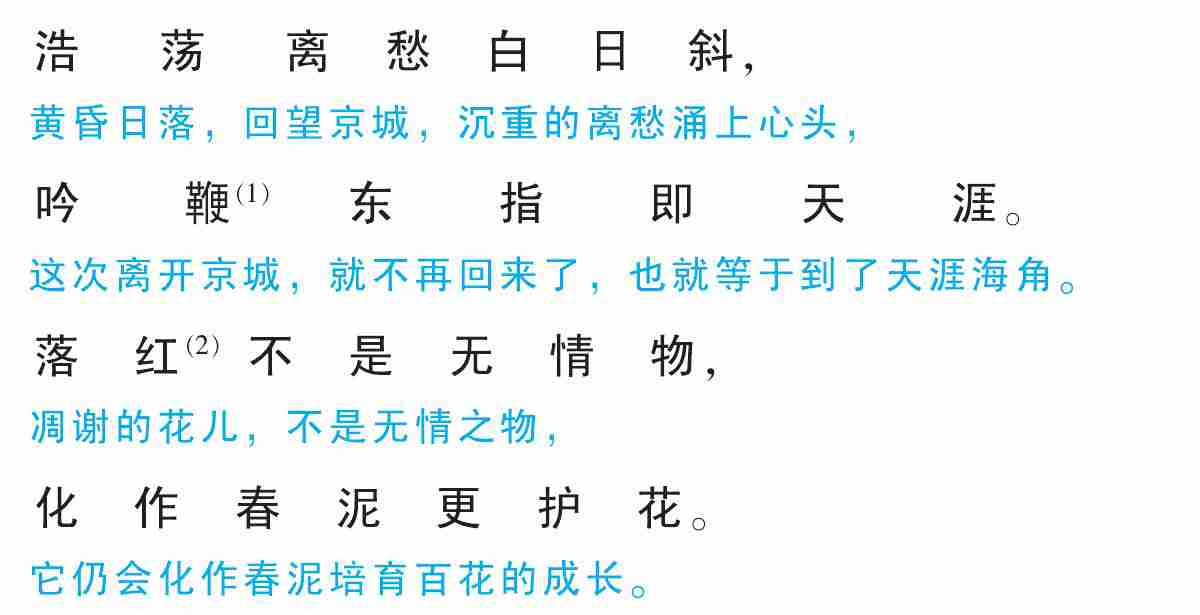 (1) 〔吟鞭〕 马鞭。 吟, 指吟诗。 (2) 〔落红〕 落花。 后两句诗的言外之意是说, 自己虽然辞官, 但仍会关心国家的前途和命运。