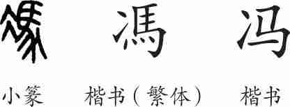 “冯”是形声字。小篆从馬,冫声。隶变后楷书写作“馮”。汉字简化后写作“冯”。