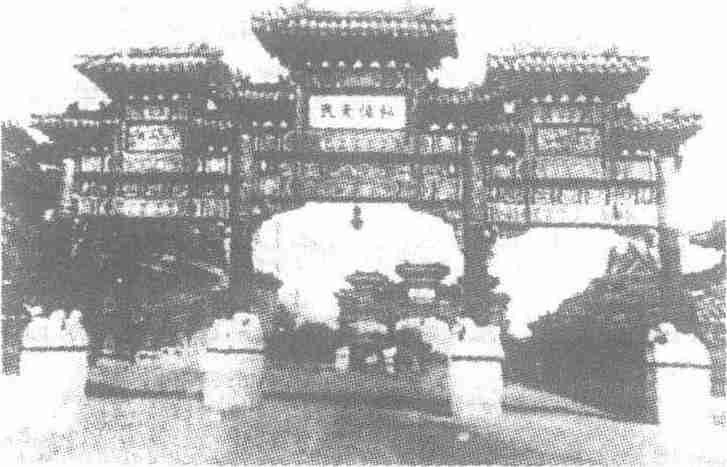 又名牌坊,是古代用于标识、纪念、装饰的一种建筑物。从建筑材料上看,牌坊一般可以分为木牌楼、石牌楼和琉璃牌楼三种。木牌楼由木料建造而成,一般构造方式是从地上立起单排柱子,柱与柱之间通过横枋连接在一起,枋子上安顶,顶的形式一般有悬山式、歇山式、庑殿式等。为了加强牌楼的稳定性还在柱子的两边加戗木斜撑地面。木质牌楼色彩鲜艳,但易受风雨腐蚀损坏,因而产生了石牌楼。石牌楼在建筑构架上类似于木牌楼,但坚固耐久,只是色调较为单一。琉璃牌楼的出现既保持了木牌楼的式样,又通过在牌楼外贴琉璃和瓦拼出柱子、枋子、斗拱和木结构的屋顶形式,色彩华美。牌楼规模的大小常以柱子的多少和屋顶的多少来作依据,最简单的就是两根柱子组成一个开间,顶上有一个单檐屋顶,这种样式的牌楼被称为两柱一间一楼式。其余的形式还有四柱三间、六柱五间等。除总体形象的塑造外,牌楼还十分注意应用装饰来丰富表现力,如木牌楼的顶部有正吻、走兽;瓦上有勾头、滴水。牌楼身上布满彩画,石牌楼的装饰则依靠石雕来表现,从屋顶到檐下甚至牌身全部都采用石雕。有些作为标志性和纪念性的牌楼,往往在牌楼中央开间的横枋上题字以表现牌楼的重要作用。