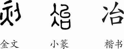 “冶”是会意字。金文左上部的二短横表示金属块,下部为“火”,右边的“刀”表示以“火”熔化金属而铸造刀器之意。隶变后楷书写作“冶”。