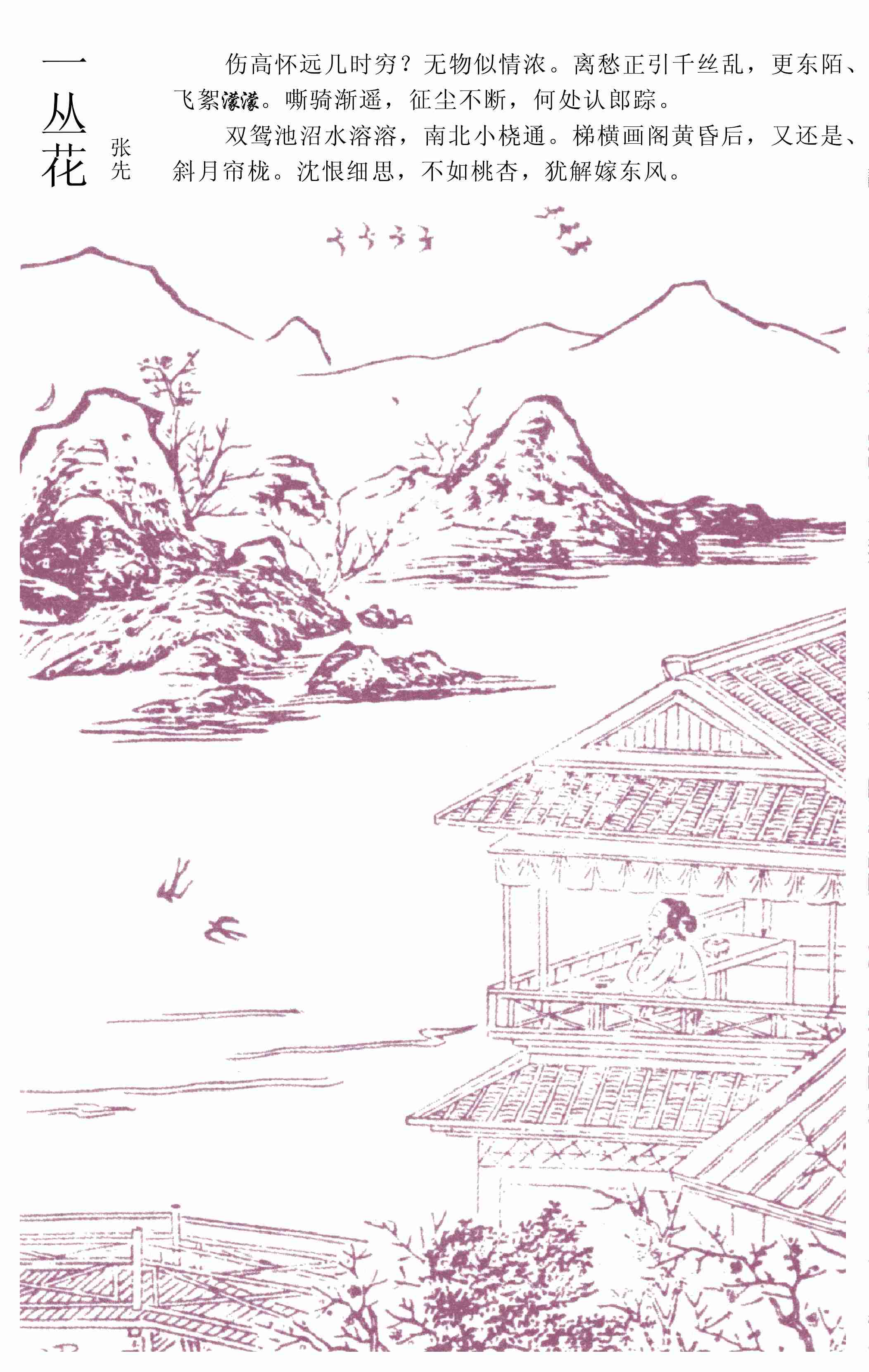 杨湜《古今词话》:张先字子野,尝与一尼私约。其老尼性严。每卧于池岛中一小阁上,俟夜深人静,其尼潜下梯,俾子野登阁相遇。临别,子野不胜倦倦,作《一丛花》词以道其怀。