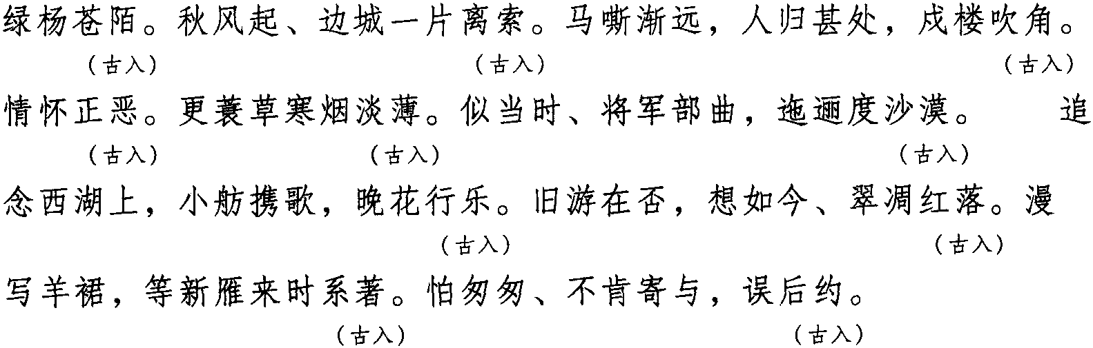 注:本词例押古入声“觉” “药” “陌” 韵。因“觉” “药” 在现代韵中与“幄” “索” 同韵,而“幄” “索” 与“波” 同韵,“陌”在现代韵中亦属“波” 韵,故全调可押歌部“波” 韵。