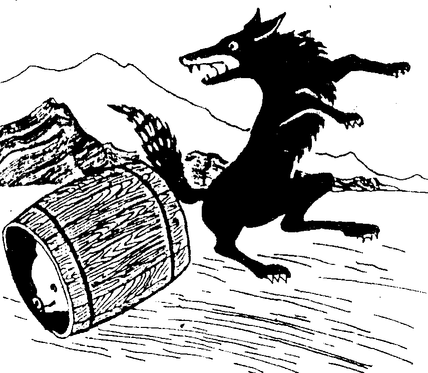 “这样说起来,你是在怕我哪! 老实对你说吧! 我在集市买了一个制奶油的桶,因为看到你来了,我就躲进桶里,从山坡上滚了下来。”