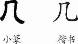 “几”是象形字。小篆的形体像古人席地而坐时有靠背的坐具之形。隶变后楷书写作“几”。